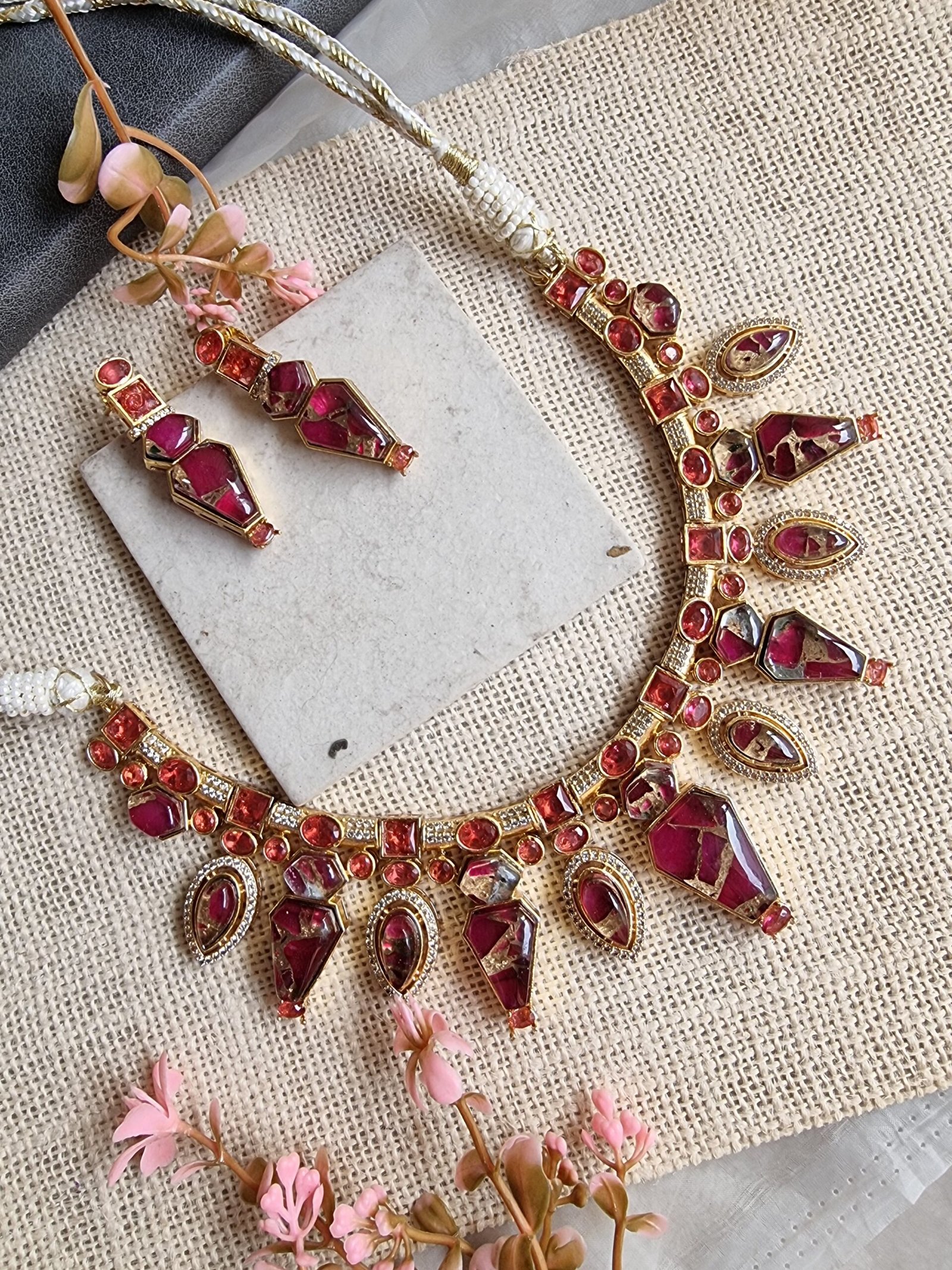 NIRALI NATURAL STONE GOLD PLATED RED NECKLACE WITH ARRINGS